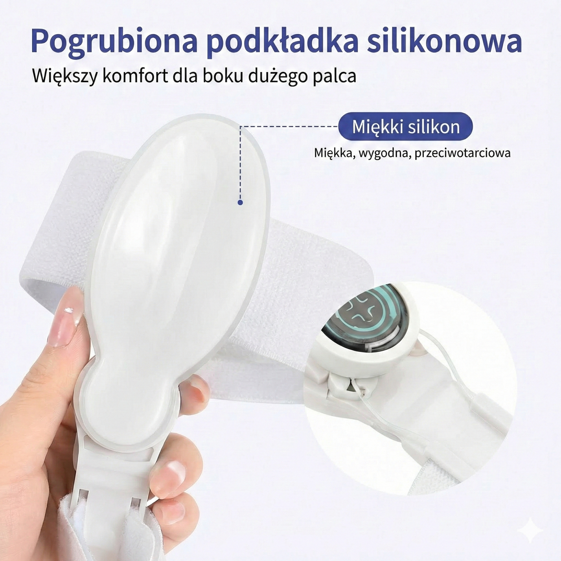 Mechanizm precyzyjnie odciąga duży palec, redukując ucisk na staw i przynosząc ulgę.
